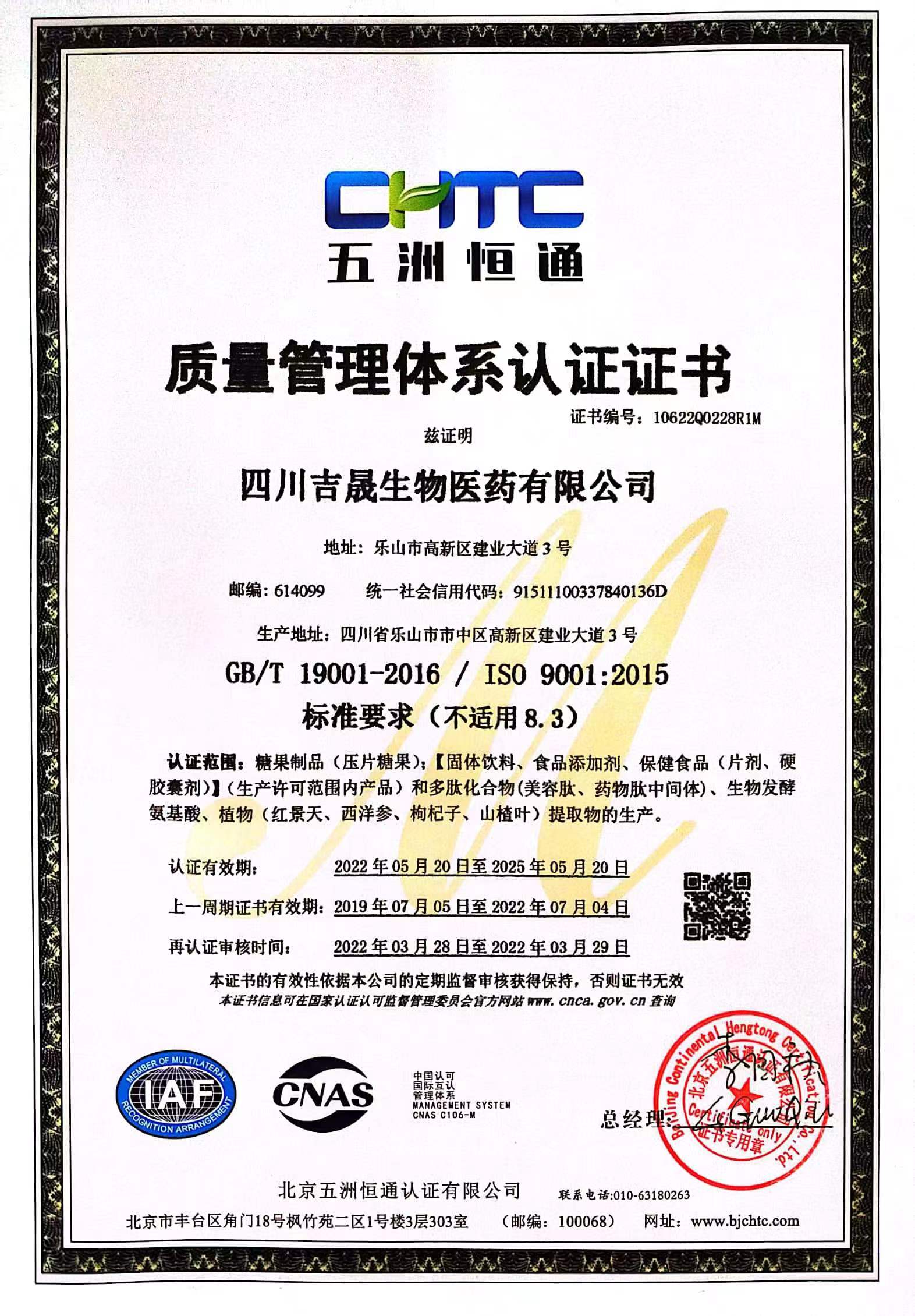 四川吉晟生物醫(yī)藥有限公司成立于2015年,位于四川樂山高新技術(shù)開發(fā)區(qū),工廠占地面積6萬多平方米,是一家集產(chǎn)品研發(fā)、生產(chǎn)、銷售為一體的國家高新技術(shù)企業(yè),通過了ISO9001、Kosher質(zhì)量認(rèn)證,2022年榮獲樂山市首家“瞪羚企業(yè)”。